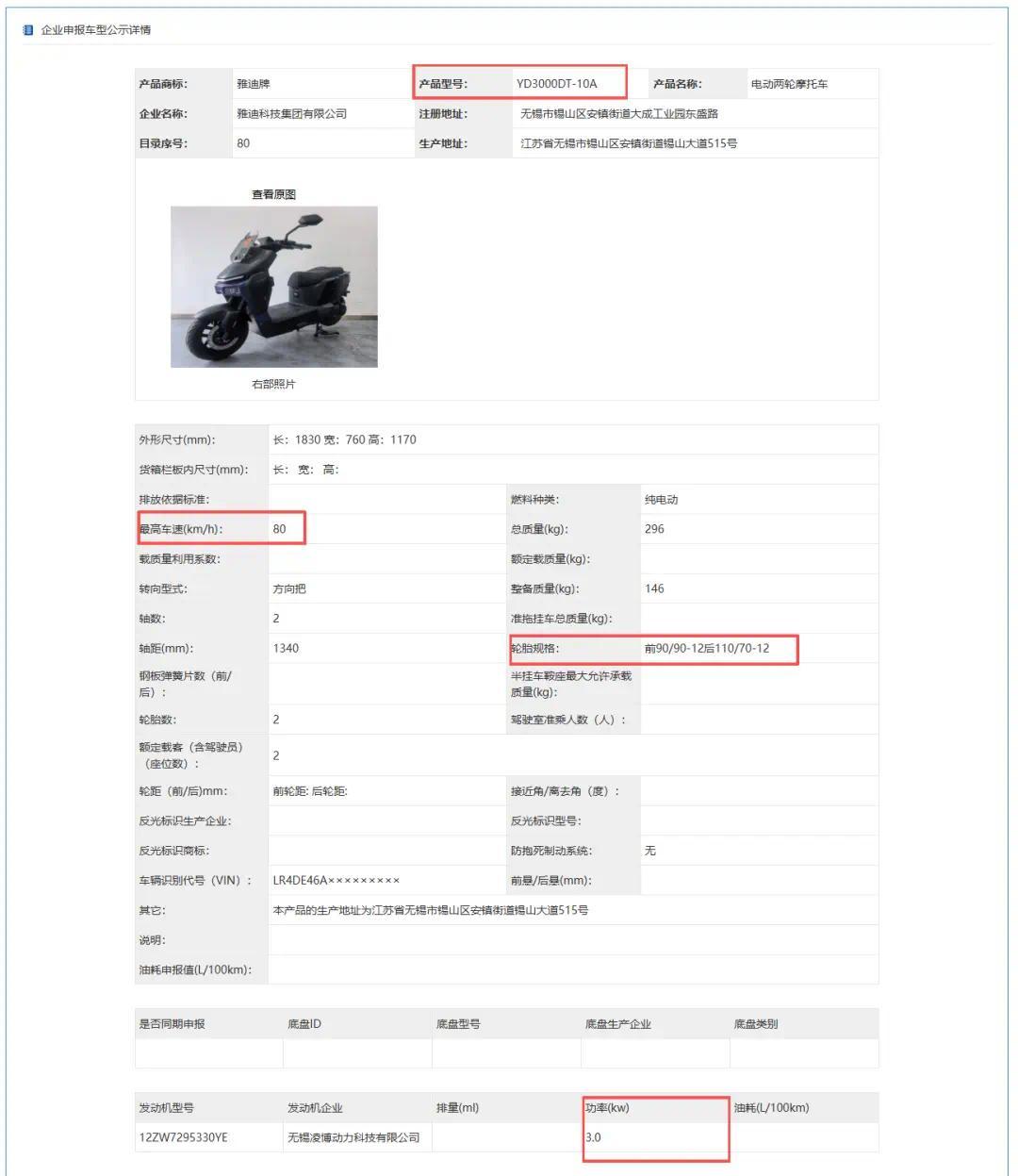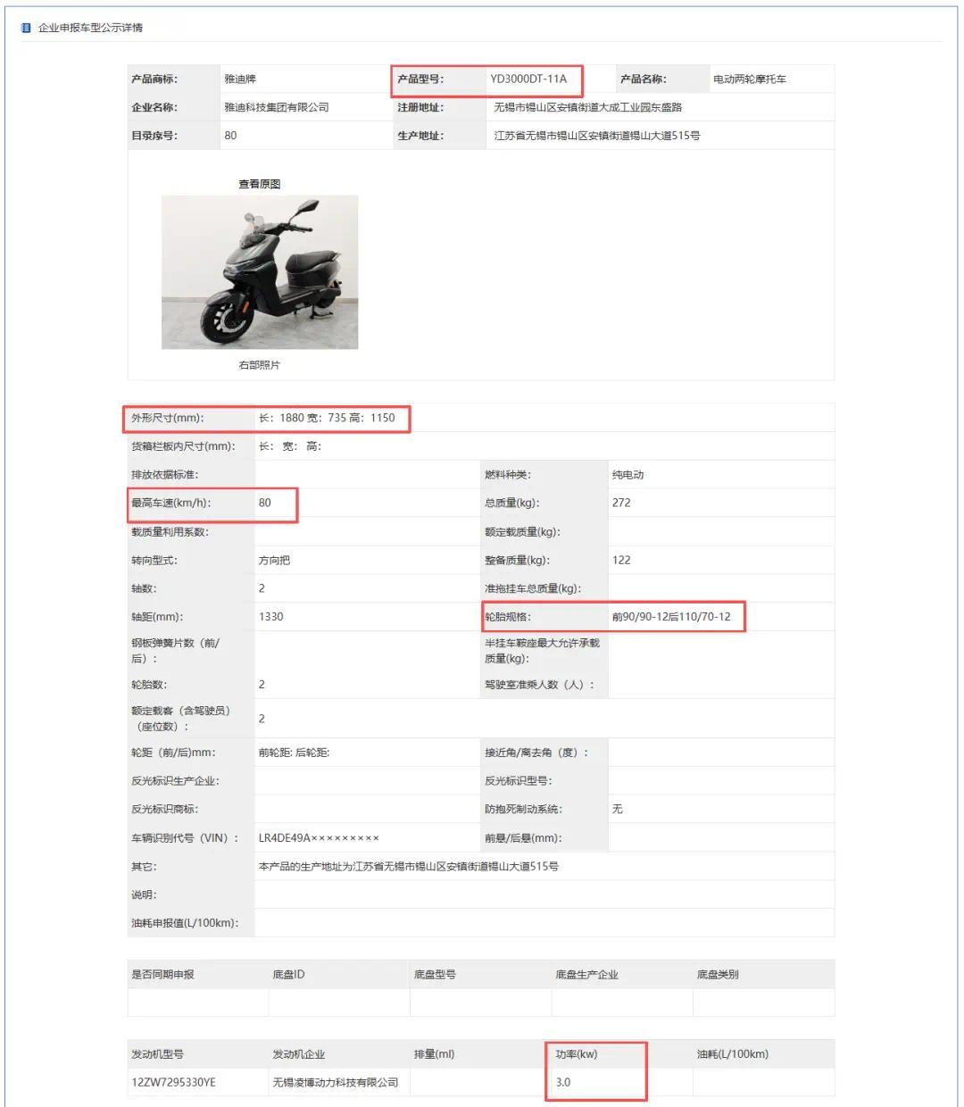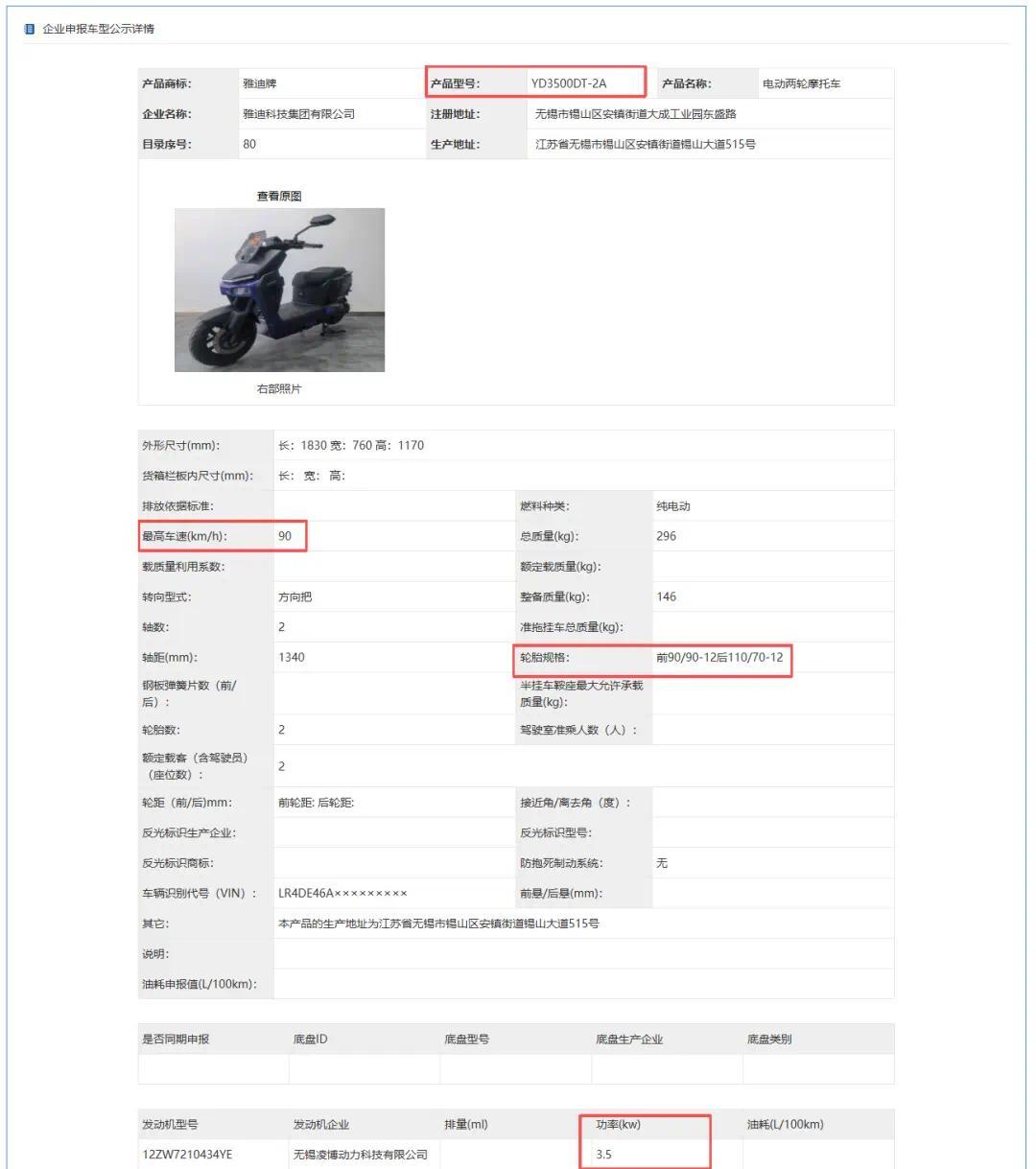 除了星舰系列,雅迪还申报了一款型号为YD3000DT-11A的新车。这款新车车身长度较星舰系列更长来到了1880mm,车辆重量则更轻为122kg,同样搭载3000W电机,时速80km/h,看来也是一款兼顾实用与性能的新车型。