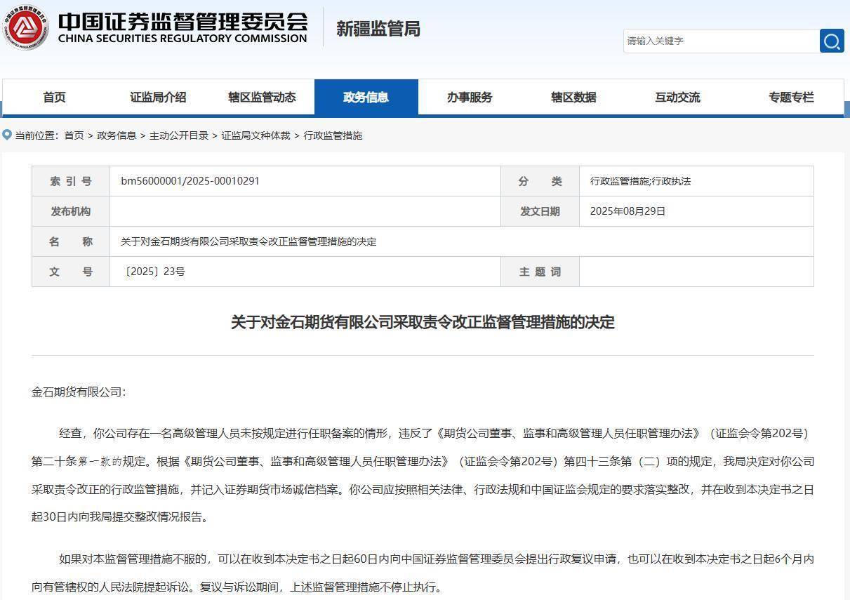 根据《期货公司董事、监事和高级管理人员任职管理办法》(证监会令第202号)第四十三条第(二)项的规定,新疆证监局决定对金石期货有限公司采取责令改正的行政监管措施,并记入证券期货市场诚信档案。