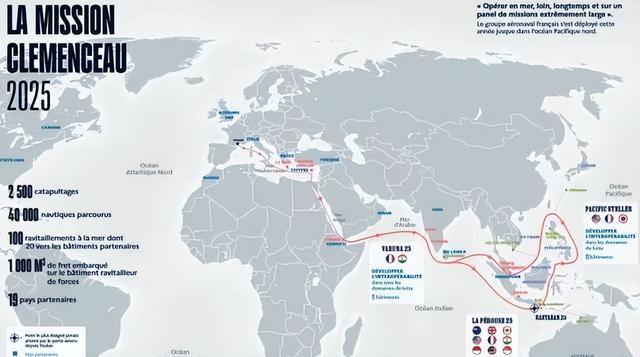 这次部署是法国海军自1960年代以来首次将航母打击群派往太平洋,编队包括戴高乐号航母、防空驱逐舰、多用途护卫舰、补给舰和一艘攻击型核潜艇。