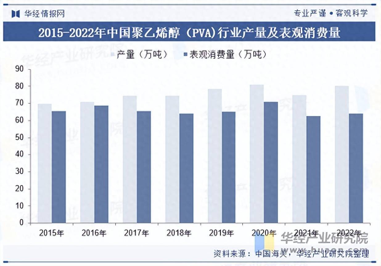中国是全球PVA生产大国,自 1965 年北京东方石油化工有限公司( 原北京有机化工厂) 从日本引进技术建成我国第一套电石乙炔法( 1995 年由电石乙炔法改为石油乙烯法) PVA 生产装置以来,我国PVA的生产稳步发展。据统计炒股配资股票,2015年我国聚乙烯醇(PVA)产量约为70万吨,2022年增长至80.2万吨,期间复合年增长率为1.96%。需求方面,2022年我国PVA表观消费量为63.96万吨,同比增长2.16%。