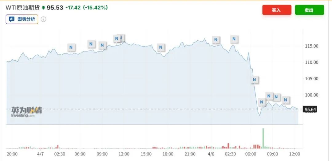 由巴基斯坦紧急斡旋的一纸两周临时停火协议突然落地。消息传出,紧绷至极的市场情绪瞬间缓解,布伦特与WTI原油期货价格直线跳水,狂泻超15%,双双击穿100美元大关,美股期指与黄金随之剧烈震荡。
